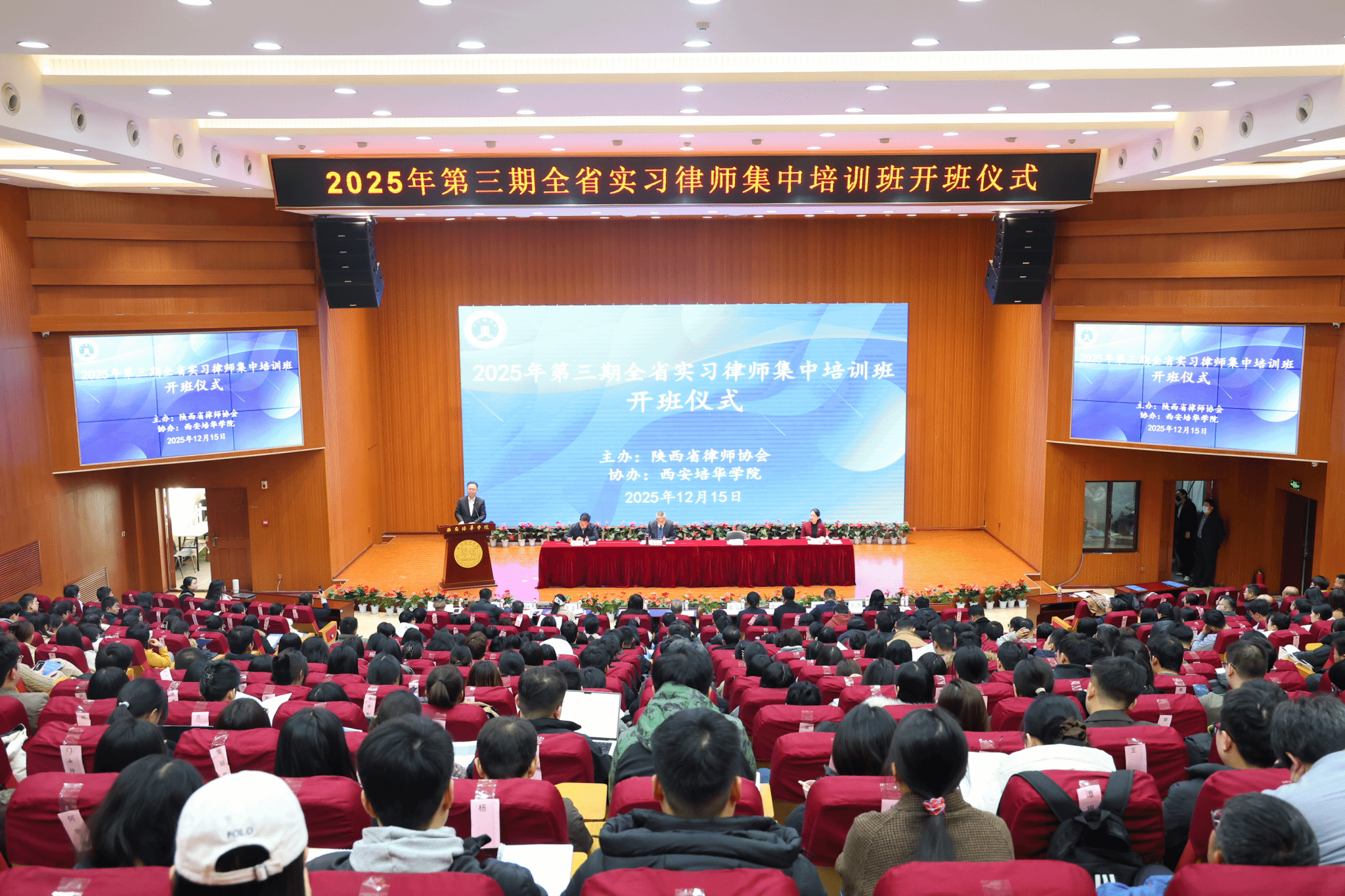 为了加强律师队伍建设、落实国家职前培训要求,并培养德才兼备、适应社会需求的应用型法律人才,12月15日,陕西省律师协会2025年第三期全省实习律师集中培训班开班仪式在培华维之图书馆报告厅举行。全国律协副会长、陕西省律师行业党委副书记、省律协会长韩永安,省律师行业党委委员、省律协监事长方燕,省律协副秘书长杨新宁,省律协实习考核委员会主任党海峰,西安培华学院理事长姜波,西安培华学院法学院院长王鸿貌等领导出席仪式。仪式由陕西省律师协会主办,西安培华学院法学院承办,省律协副会长屈金冈主持,391名实习律师参加。