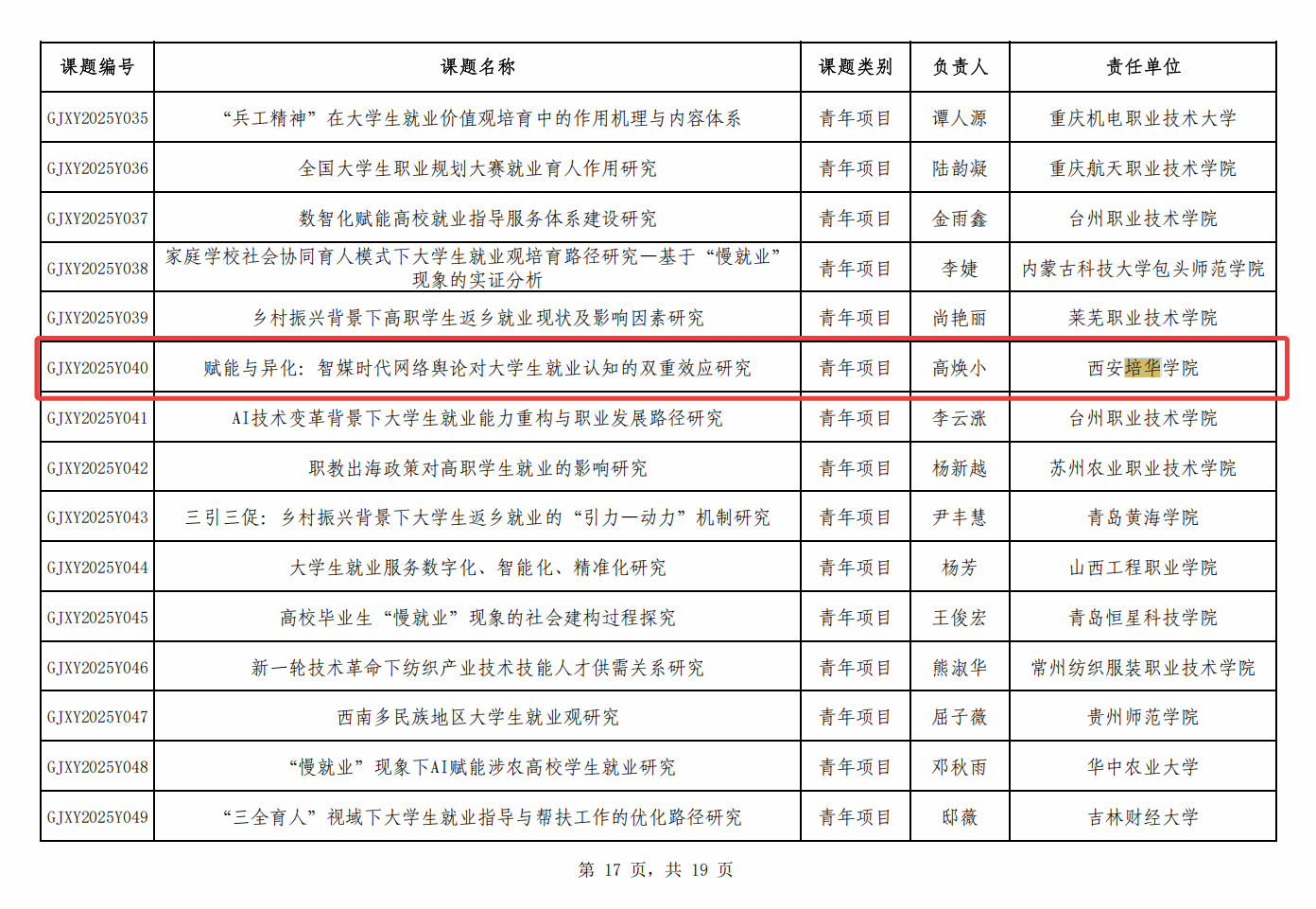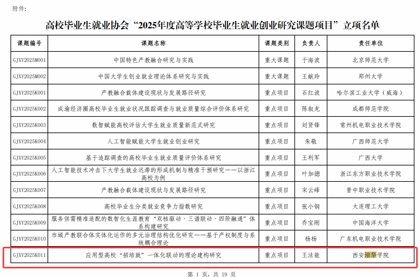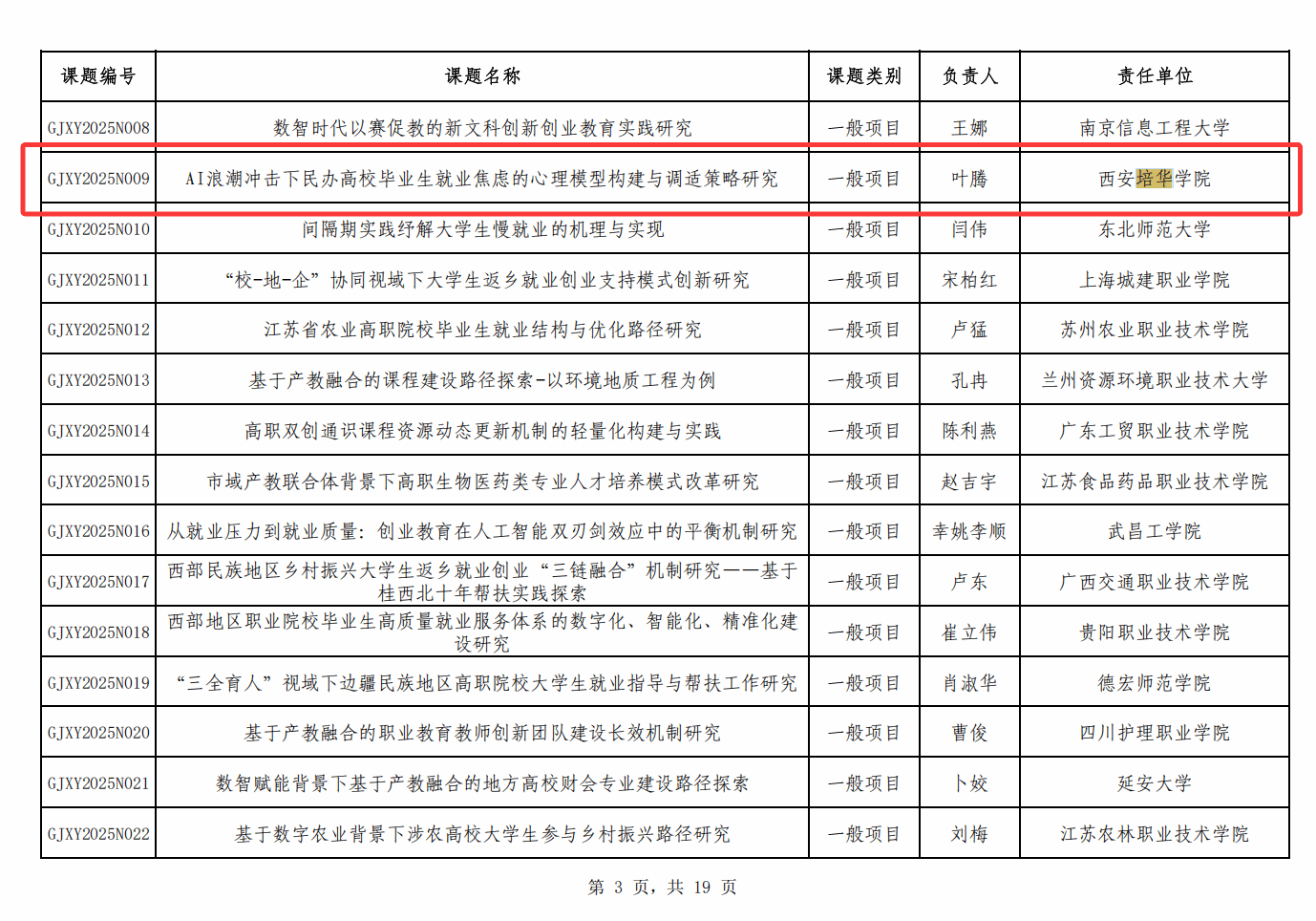 近日,高校毕业生就业协会正式公布了“2025年度高等学校毕业生就业创业研究课题项目”立项名单。我校共有三项课题成功入选,分别是:战略发展办王法能老师申报的《应用型高校“招培就”一体化联动的理论建构研究》获评为重点项目;学生潜能发展中心叶腾老师申报的《AI浪潮冲击下民办高校毕业生就业焦虑的心理模型构建与调适策略研究》获评为一般项目;传媒与设计学院高焕小老师申报的《赋能与异化:智媒时代网络舆论对大学生就业认知的双重效应研究》获评为青年项目。据悉,本次全国共立项课题274项,包括重大课题2项、重点课题19项、一般项目183项、青年项目70项。我校一举获得三项立项,展现了在就业创业研究领域的扎实积累与创新活力。