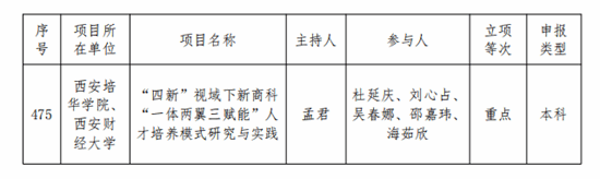 近日,陕西省教育厅2025年度高等教育教学改革研究项目拟立项名单公示,由西安培华学院会计与金融学院联合西安财经大学申报的《“四新”视域下新商科“一体两翼三赋能”人才培养模式研究与实践》项目成功获批重点项目,标志着两校在新商科教育改革领域的探索获得省级权威认可。