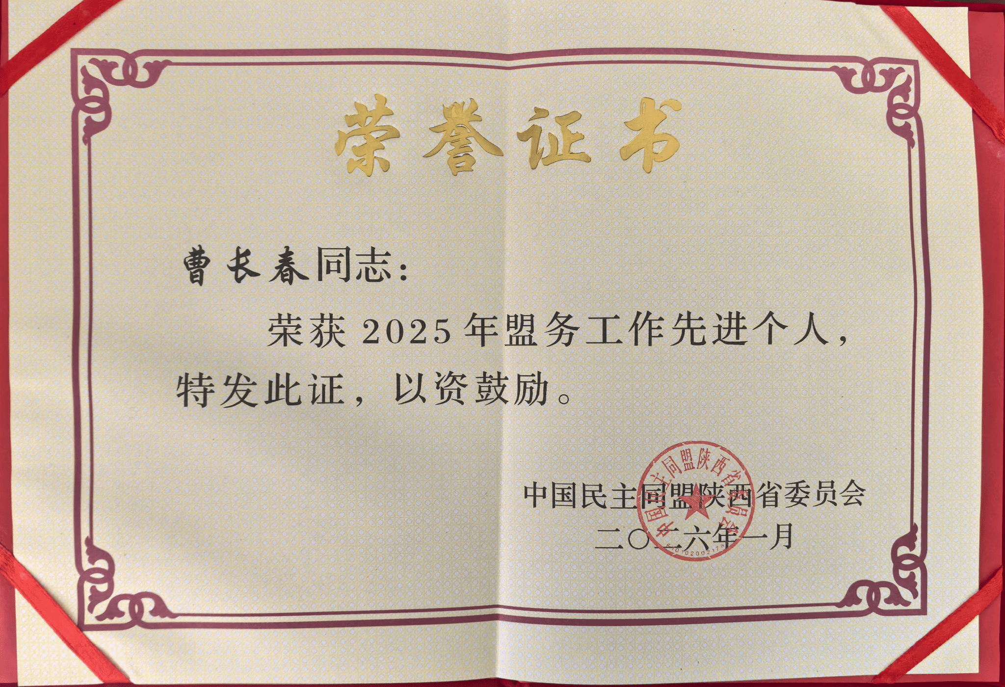 2025年,我校民盟支部工作成效显著,获评民盟陕西省委2025年度盟务工作先进集体;曹长春同志荣获先进个人称号。