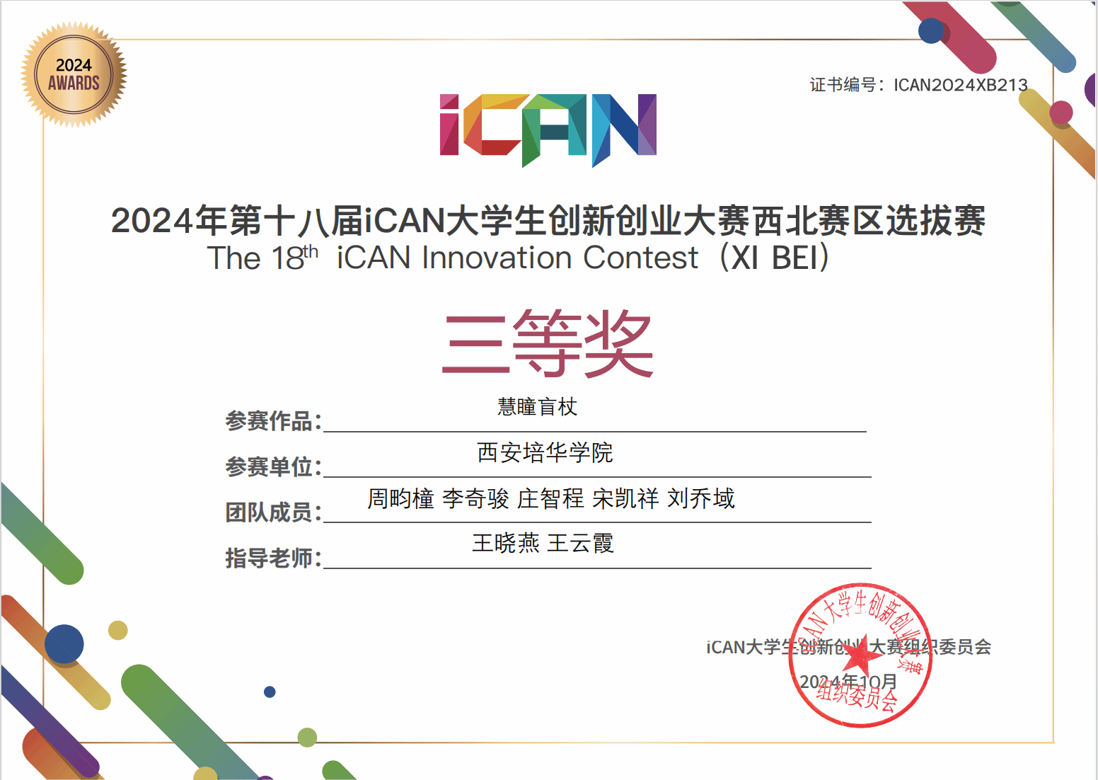 学生在2024年第十八届iCAN大学生创新创业大赛西北赛区选拔赛中获三等奖