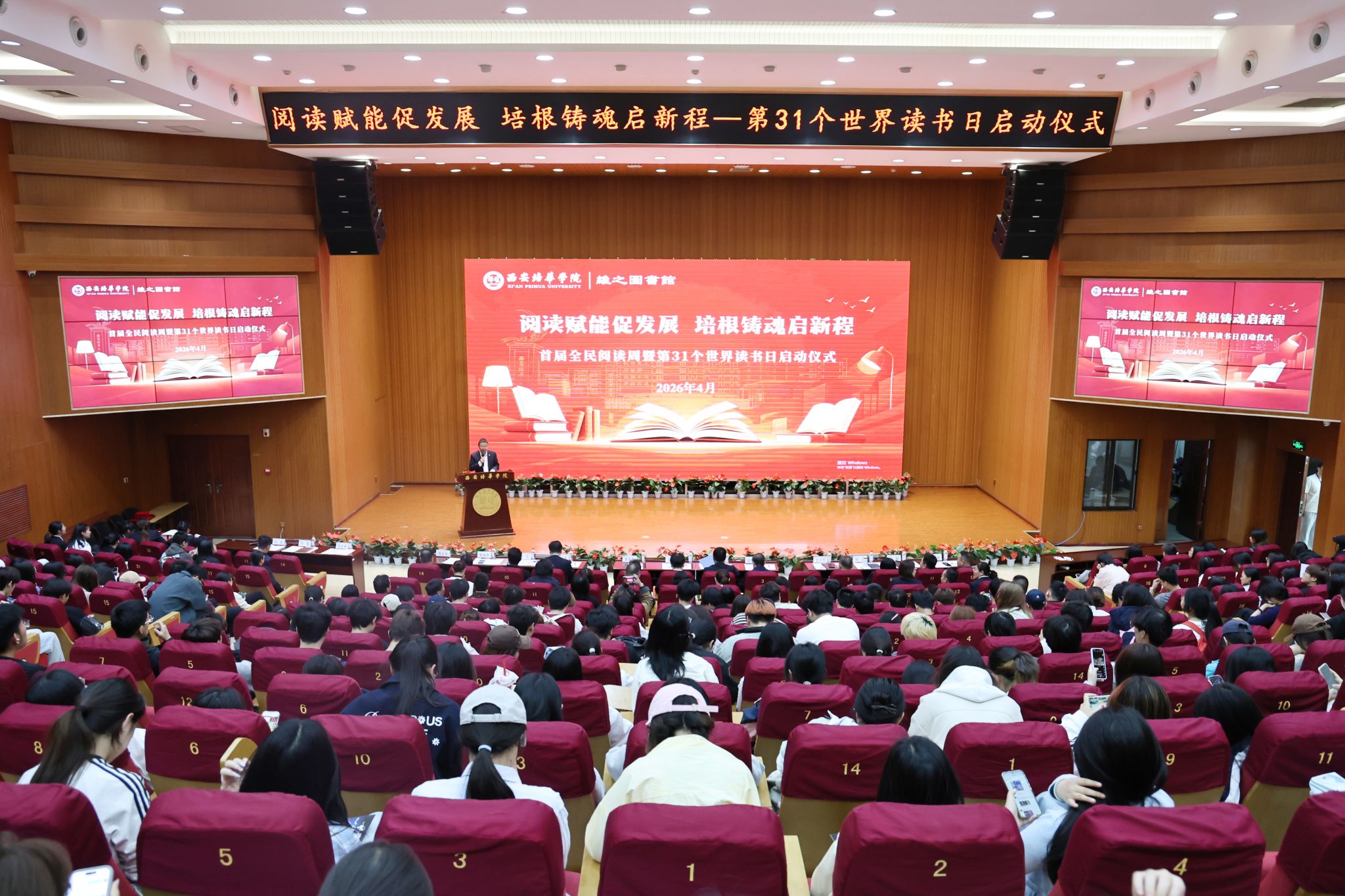 阅读赋能促发展,培根铸魂启新程。4月23日下午,西安培华学院在图书馆报告厅举行首个全民阅读周暨第31个世界读书日启动仪式。理事会秘书长、副校长姜瀛初及师生代表400余人参加,启动仪式由图书馆馆长闵波主持。