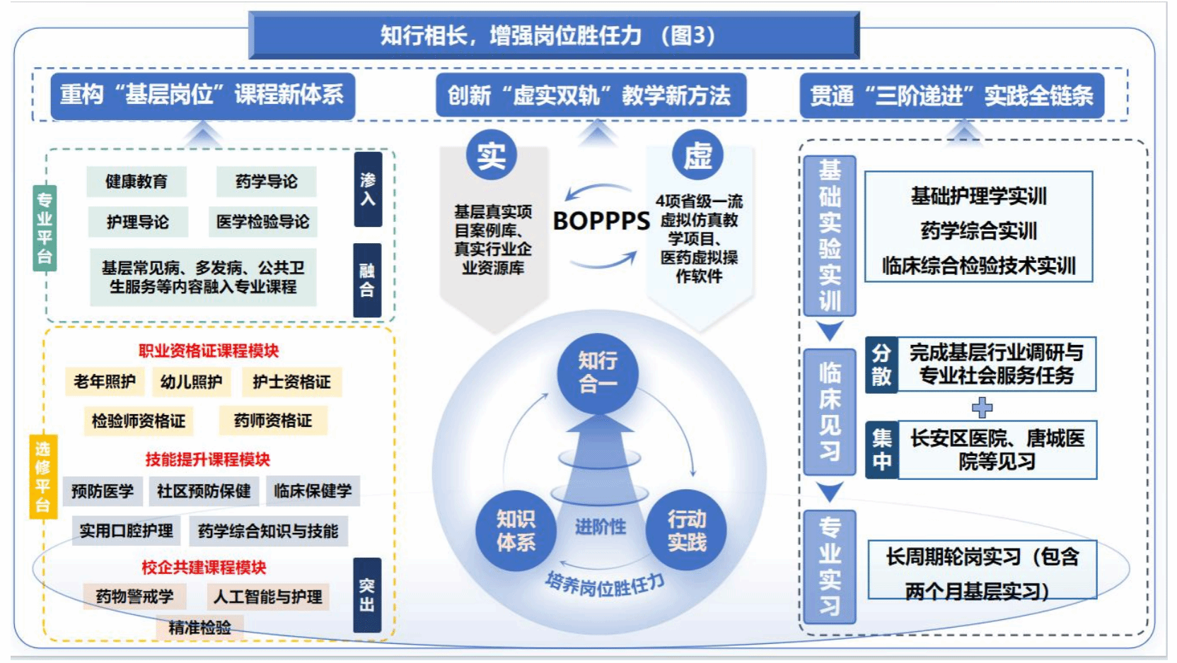 重构适配基层岗位的课程体系,贯通“基础实训-临床见习-基层实习”三阶实践链条,创新虚实双轨教学方法,让学生在实战中锤炼基层诊疗、健康服务等核心技能,实现“书本知识”与“临床实战”无缝对接。