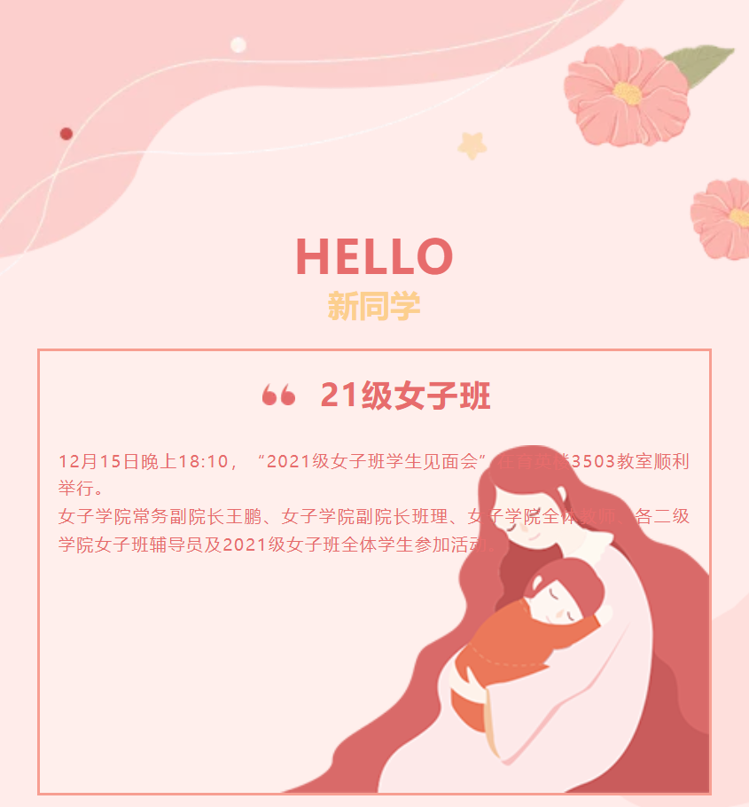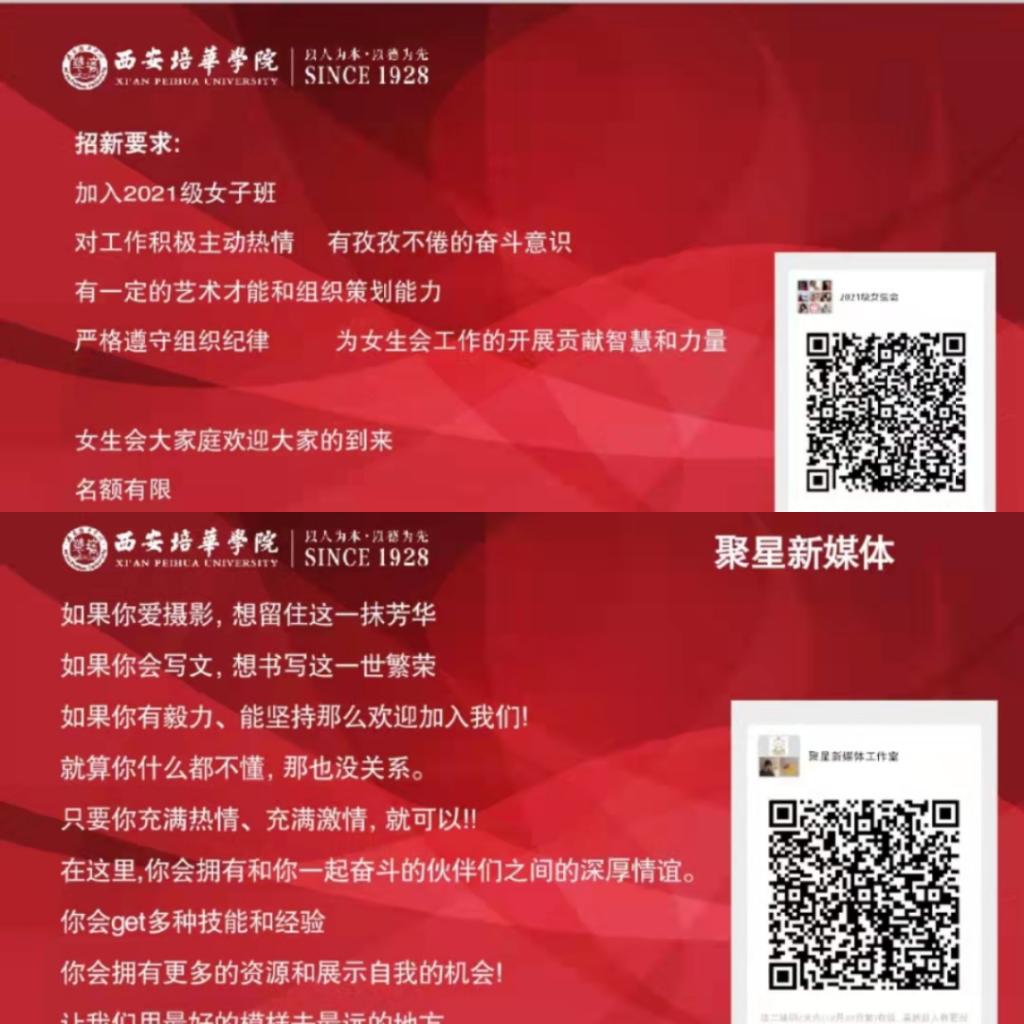 女子学院学生管理委员会和女子学院下设学生组织聚星新媒体,面向2021级女子班学生展开纳新,吸收新鲜血液,助力未来女子学院更好的发展。