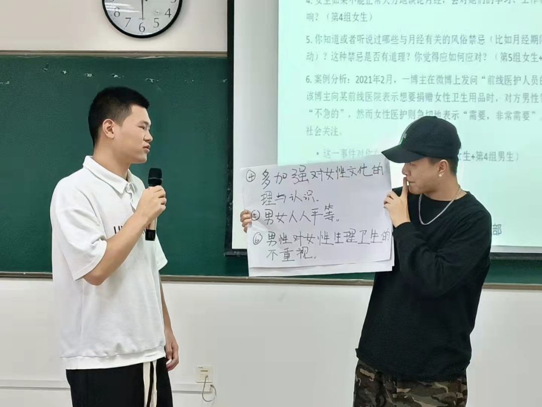 周安秦女士就健康知识进行普及宣讲,在课堂上介绍了当月经来临时应注意的卫生问题,痛经问题以及解决措施,并向同学们普及了性相关知识,科学保护身心健康。围绕同学们感兴趣的问题进行课堂小组讨论,并进行讨论结果展示。