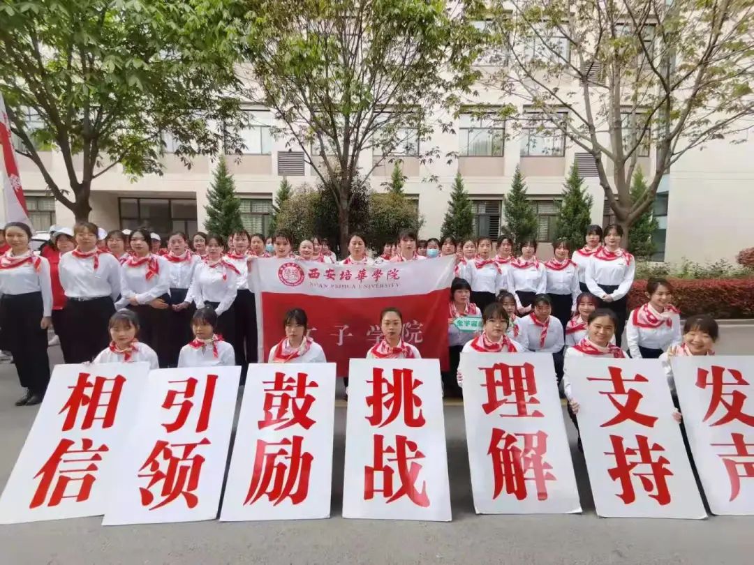 在运动会开始前期,为了展现女子学院的特色风貌、学生风采,女子学院师生积极组织排练并参与配合运动会的相关工作,在时间紧、学习任务重的情况下,女子学院2020级女子班80余名同学,从4月6开始全部集中在校体育场开始了方阵训练,同学们抽出午休时间来参加训练,西安培华学院女子学院副院长班理女士及老师们也多次到训练场指导学生。