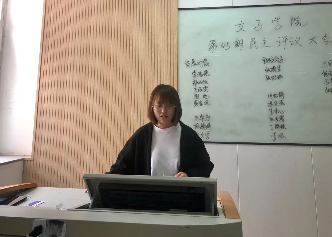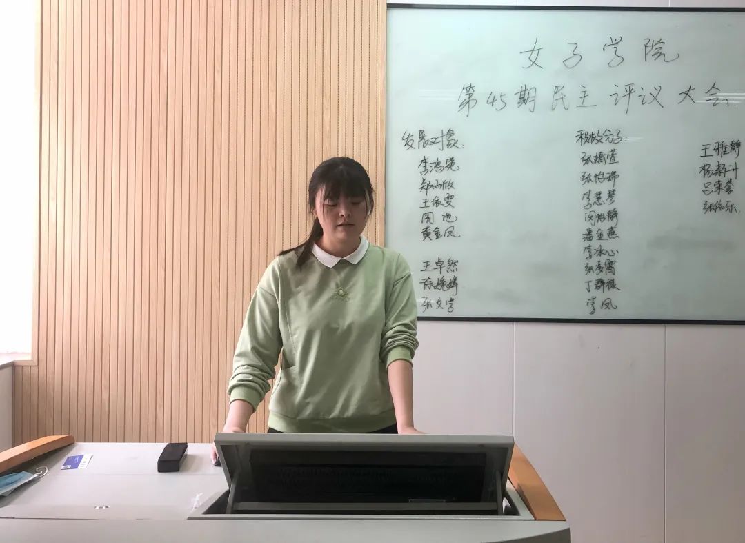 李鸿菀作为第一个上台的发展对象候选人,作为女生管理委员会的副主席,她在工作中认真踏实,在学习上努力严格要求自己。她积极的表达了对党的衷心热爱,承诺在未来的工作学习中,能够不忘初心,继续前进。