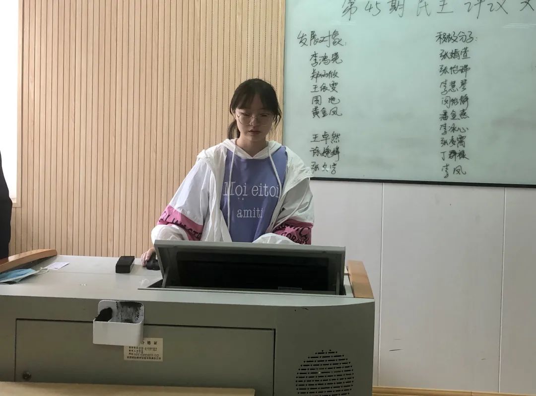 王雅静同学自然大方的向大家进行了自我介绍,回顾了自己在组织的成长过程。和大家分享了自己的成长心得体会,讲述了自己深受党的影响,表露出了渴望接受党组织的教育,成为一名优秀的共产党员。