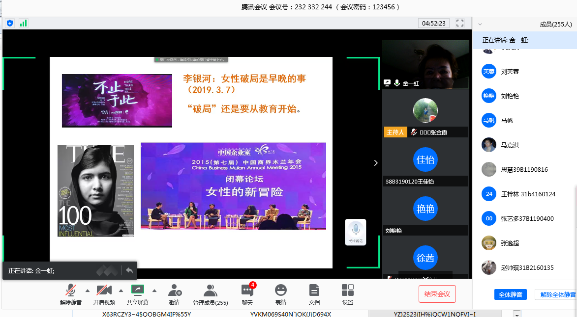 讲座最后她希望男生女生要勇敢的打破性别偏见,积极的去挑战现实和自我,在不同的职业和岗位上贡献自己的智慧和才华,使人生更加丰满和多彩。