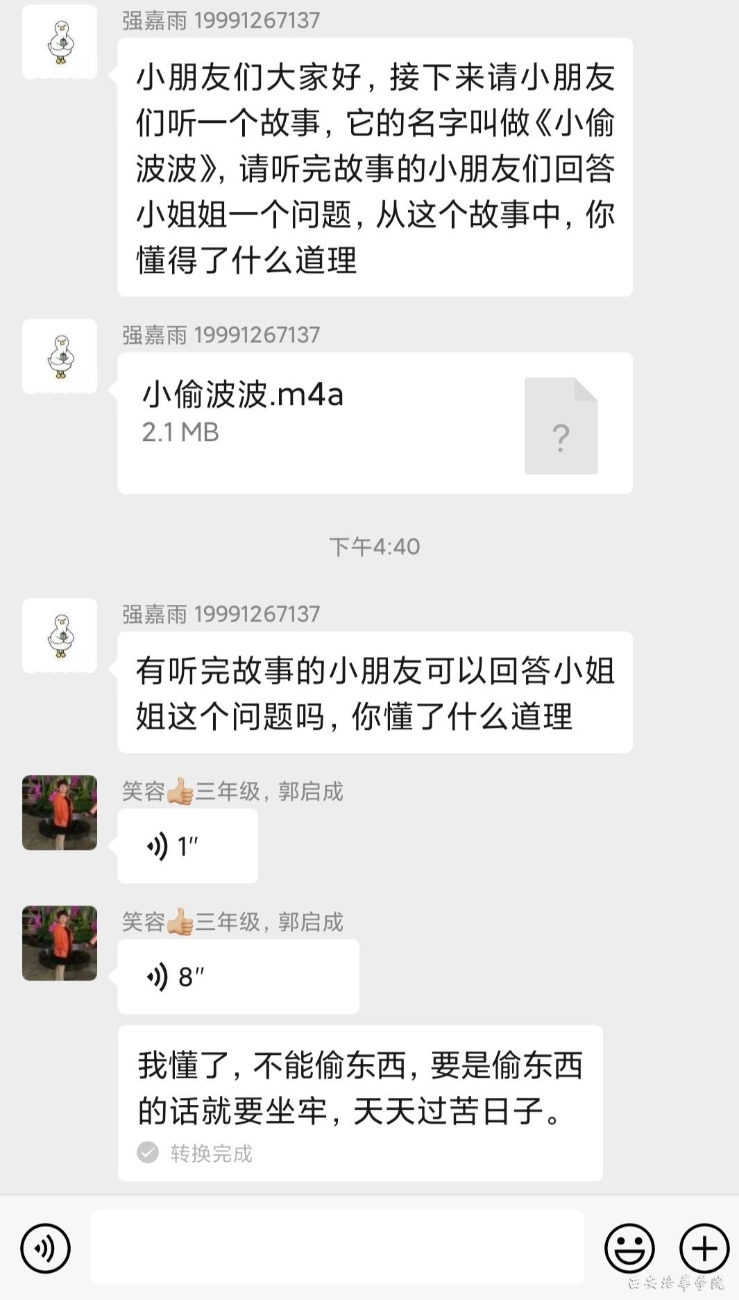 第一个故事是由故事组的强嘉雨带来的音频《小偷波波》,由波波的下场警示小朋友们要做一个正直的人。最后强嘉雨告诉小朋友们,养成一个好习惯需要从现在做起。第二个节目是由故事组贾冰洁带来的视频《善良的心》,故事从“什么人是善良的人”为切入点,小朋友们踊跃回答出了自己所遇到的善良的人,有不仅有邻居、老师也有陌生人。教导小朋友们一定要像那些帮助过自己的善良的人学习,多多帮助别人。第三个故事是宫慧霞带来的《猪八戒吃西瓜》,宫慧霞从“是否看过西游记、西游记里有哪些主要人物”来勾起小朋友们的好奇心,旨在教会小朋友们要懂得分享,小朋友们也懂得了,“只有分享才能带来快乐”的道理。第四个故事是由李舒羽姐姐为我们带来的《斑羚飞渡》小故事:他讲述老羚羊为保护小羚羊而自愿走向死亡。随即转到我们的父母哺育我们成长,就像老羚羊一样,不求回报,教导我们要爱护自己的父母。