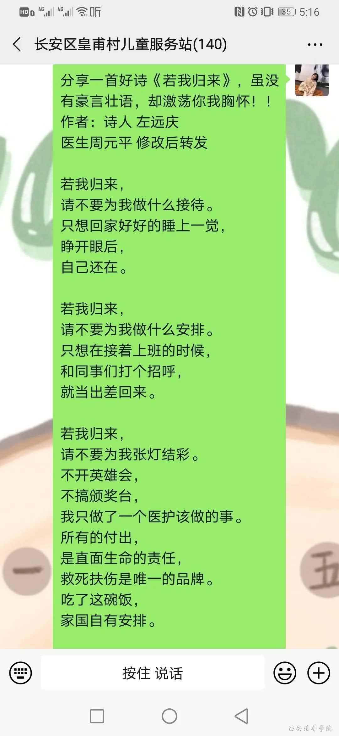 第五个活动是由今天下午组的志愿者们带来的一首诗歌朗诵《我若归来》,这首改编诗歌以医护人员们为原型,描述了他们期待的归来时的心情活动,展现着他们的医者仁心。