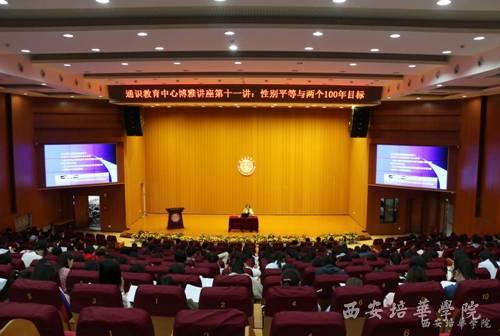 5月25日,我院副院长金沙曼教授以“性别平等与两个一百年目标”为题在维之图书馆进行我校博雅讲座第十讲讲座。副院长金沙曼教授是中国妇女研究会理事、中国妇女研究会妇女教育专业委员会理事、中共陕西省委党校妇女/性别研究与培训基地原常务副主任、妇女研究中心原常务副主任,在女性科研和学术研究方面有较为深厚的学术造诣。我校通识教育中心部分教师及400位学子参与了此次活动。