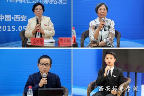 女子学院副院长金沙曼(左上)、省婚姻家庭研究会会长高小贤(右上)、《中国妇女报》驻陕西站站长党柏峰(左下)、校学生会副主席路文凯(右下)从不同的角度解读“男女平等基本国策”,