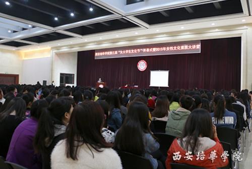3月31日,以“珍爱生命,维护权益”为主题的西安培华学院第三届“女大学生文化节”开幕式暨2015年女性文化素质大讲堂首讲在汇知楼阳光厅举行。著名作家、该校女子学院院长叶广芩等500余名师生代表参加了此次活动。