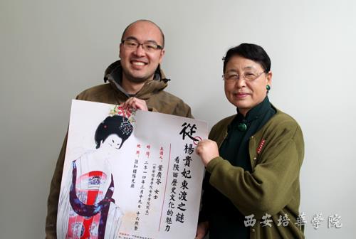 ⑥叶广芩院长与荣光老师在一起,并感谢为“从杨贵妃东渡之谜看陕西历史文化的魅力”报告会设计海报。