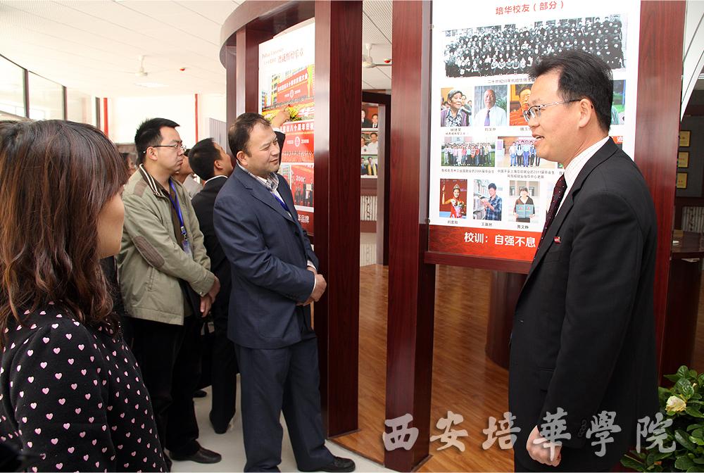 在我校理事长姜波的陪同下,媒体考察团一行首先参观了我校明德楼展厅,姜波理事长向到访来宾详细地介绍了我校的历史沿革、基本概况、办学理念、办学特色、学科建设、校园文化建设、人才培养创新等诸多方面内容。“这一张张照片,一行行文字,都代表着培华这八十四年来所经历的风雨和取得的成就,那些艰苦奋斗的岁月,一代代培华人永远铭记在心……”在听到培华老校长姜维之先生的生平事迹和当年老培华不收取任何费用,培养造就了一批优秀的平民女性时,来宾们纷纷表示对培华精神的敬佩和取得成绩的肯定。我校电气信息工程学院王旭东同学向来宾介绍了他的团队在校创新实验室里设计制作的电子产品,来宾们赞叹不已。