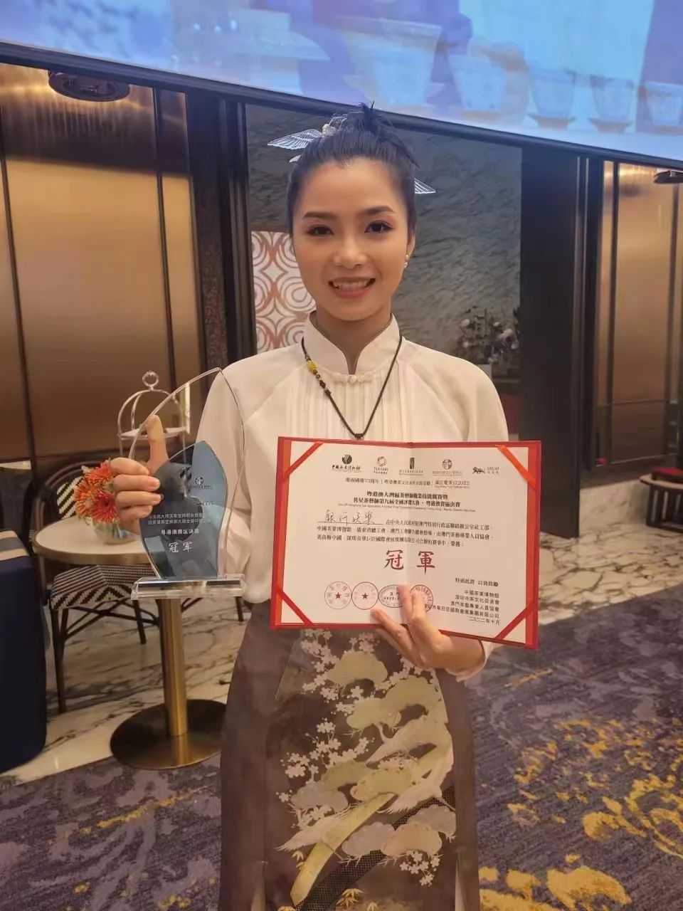 2022年10月18日,“澳门银河”茶艺团队之一的杨彩婷,在“粤港澳大湾区茶艺师职业技能竞赛暨茗星茶艺师第九届全国评选大赛-粤港澳赛区决赛”夺得冠军,并将代表澳门出席“茗星茶艺师第九届全国评选大赛年度总决赛”