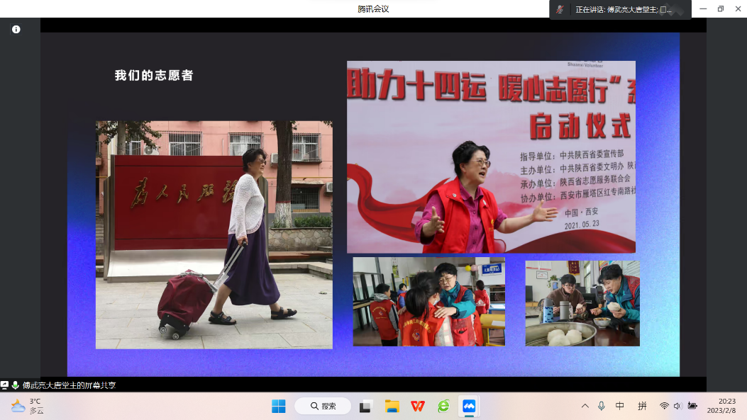 班理院长介绍了此次志愿服务培训及主讲嘉宾傅武亮老师。傅武亮老师是中国旅游质量万里行理事长、中国旅游合作联盟理事,2021年10月23日至25日,受省政府委托参与中国杨凌农高会云端直播,全网线上浏览量2.7亿、海内外浏览量6.7亿。傅武亮老师参加了大量的志愿服务活动,用手机记录下了志愿精彩瞬间。
