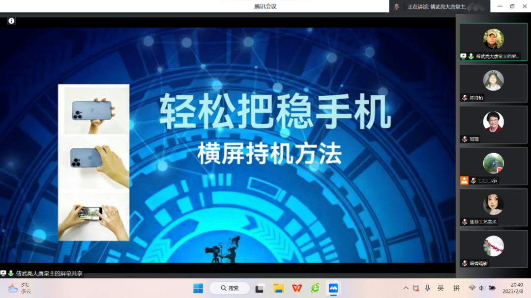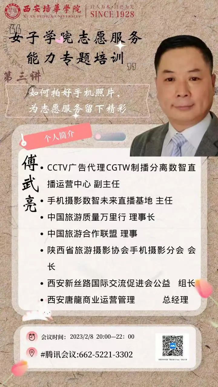 2023年西安培华学院女子学院志愿服务能力建设系列培训共安排了五讲课程。2月8日晚上八点至十点,西安培华学院女子学院邀请CCTV广告代理CGTW制播分离数智直播运营中心副主任、手机摄影数智未来直播基地主任、陕西省旅游摄影协会手机摄影分会会长傅武亮老师在第三讲对女子学院巾帼志愿者们进行“如何亲手定格志愿服务精彩瞬间”志愿服务培训。