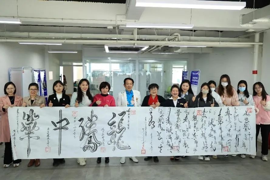 座谈会期间,书法家宋崇岳先生向女子学院赠送了名为《龙腾中华》的书法作品,并和女子学院教职工以及学生代表合影留念,记录这一珍贵时刻。