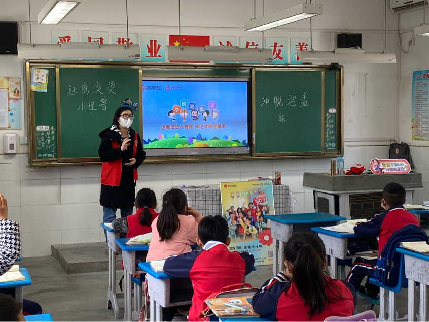 志愿者张婧帆首先在课前进行了倡导活动的演讲。小儿烧烫伤的比例逐年升高,烧烫伤不仅会给儿童的心理和生理创伤,也会给家庭带来巨大经济负担和心理压力。而儿童烧烫伤最主要原因是看护人缺乏警觉性、缺少正确的急救知识,对烧烫伤危害认识不足造成的,我国预防烧烫伤教育工作亟待全面推进。希望此次课堂活动能将如何预防烧烫伤、和烧烫伤后如何自救的科学知识带给孩子们和家长们。要让同学们不仅知道如何远离烫烫小怪兽,也要牢记“冲脱泡盖送”的五字自救口诀。提高防烧烫伤意识,需要学生、老师和家长的共同参与。