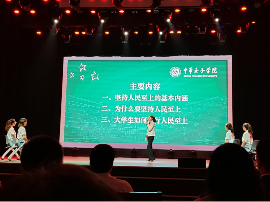 来自中华女子学院马克思主义学院教师刘扬主讲《习近平走进百姓家》进思政课示范展示:《必须坚持人民至上》,把思政课搬上了舞台,再现了师生共同学习理解为什么要坚持人民至上?怎样坚持人民至上的探索和实践。