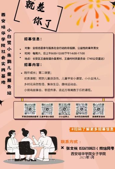经过校友陈惜的指导下,我院芳华巾帼志愿服务社团在西安培华学院团委、学生服务中心大力支持下。各二级学院的所有辅导员在班会上介绍了志愿服务场所---由陕西省红凤工程志愿者协会建在长安区王曲街道办皇甫村小白鹭,王曲村小朱鹮儿童服务站的情况,并号召同学们积极参与,以志愿服务的行动,投入到第二个中华民族伟大复兴的战略任务--乡村振兴的伟大实践中去。西安培华学院女子学院创办的芳华巾帼志愿服务管理团队,负责这次招募的具体工作,她们精心设计制作海报,并张贴在各个公寓门口的宣传墙上,扩大学雷锋做志愿服务的影响力。