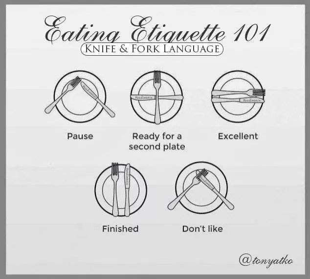 2.不要手握刀叉在空中飞来舞去用以强调说话的某一点,也不要将刀叉的 一头搭在盘子上,一头放在餐桌上;