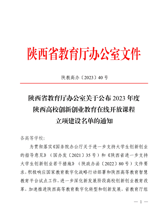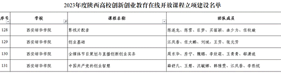 近日,陕西省教育厅发布了《关于公布2023年度陕西高校创新创业教育在线开放课程立项建设名单的通知》(陕教高办〔2023〕40号),我校陈连龙、江凤香、周东华、薛舒凡四位教师申报的课程通过了立项建设申请。