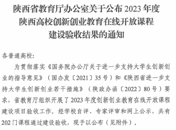 陕西省高校创新创业教育在线开放课程建设工作是省教育厅贯彻落实《国务院办公厅关于进一步支持大学生创新创业的指导意见》(国办发〔2021〕35 号)和《陕西省进一步支持大学生创新创业若干措施》(陕政办函〔2022〕80 号)相关文件的重要举措,学校通过建设陕西省创新创业教育相关的在线开放课程,为师生提供更多优质创新创业课程资源,为培育创新创业型人才奠定坚实基础。