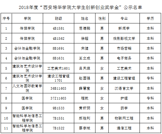为了进一步提高和加强我校创新创业工作,提高我校学生的创新创业意识及积极性,按照学校安排,根据《西安培华学院创新创业奖学金评选办法》的通知(培华院教发〔2016〕57号)文件要求及《西安培华学院学生奖学金评定办法》的相关规定,按照“公开、公平、公正、择优”的原则,本次联评通过材料考核及现场答辩的方式。经各学院推荐、学校联评最终从48名学生中评选出11位同学(名单附后)。并接受广大师生监督。如有异议或意见,请以真实姓名向评定小组电话或书面投诉。公示时间为:2018年11月20日至2018年11月22日。