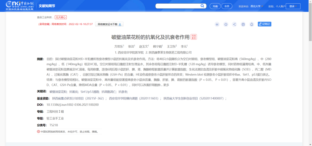 项目创新点及成果:油菜花粉外部有一层坚硬的孢子壁,阻碍了人体对其内部营养物质的吸收,花粉破壁后有利于黄酮苷的溶出和提取。目前,基于破壁油菜花粉的功效研究主要关注其提取工艺及体外的抗氧化功能,鲜有探讨其在体的抗氧化作用及对血脂的改善研究机制。SOD、MDA、CAT、GSH-PX是机体的抗氧化酶,可调控氢化氧化物的还原反应,消除体内的过氧化代谢产物对脂质过氧化连锁反应进行阻断。