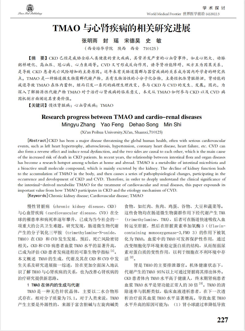 项目简介:CKD已经是威胁全球人类健康的重大疾病,其常并发严重的心血管事件,如左心肥大、动脉粥样硬化、高血压、冠心病、心力衰竭等,CVD又可形成反向作用,诱导肾功能障碍,双方互为因果关系,是导致CKD患者死亡风险增加的主要原因,近年来有关肠道菌群与器官病的关系成为国内外学者的研究热点。TMAO是一种肠道微生物菌群代谢产物,具有生物活性的小分子化合物,主要经机体肾脏排泄,肾功能的减退导致TMAO在体内蓄积,继而引发一系列的病理生理改变,参与CKD与CVD的发生、发展,为了深入了解肠原性代谢产物TMAO对于治疗心肾病的临床意义,本文从TMAD如何参与CKD以及VD病 因机制方面阐述其重要价值。