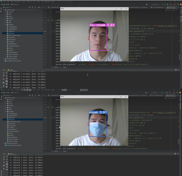 项目创新点及成果:创新点:1.用机器代替人工的方式,在核酸检测中减少交叉感染的风险;2.可以对未正确佩戴口罩及未保持安全距离的人员进行检测;3.对违规者进行个体特征的识别(如穿着、发型等特征)并通过语音播报的方式提醒;4.根据外界噪音大小调整语音播报音量,低功耗、体积小,适应性强;5.当有人无视提醒时向工作人员发送短信,使用人工的方式督促;