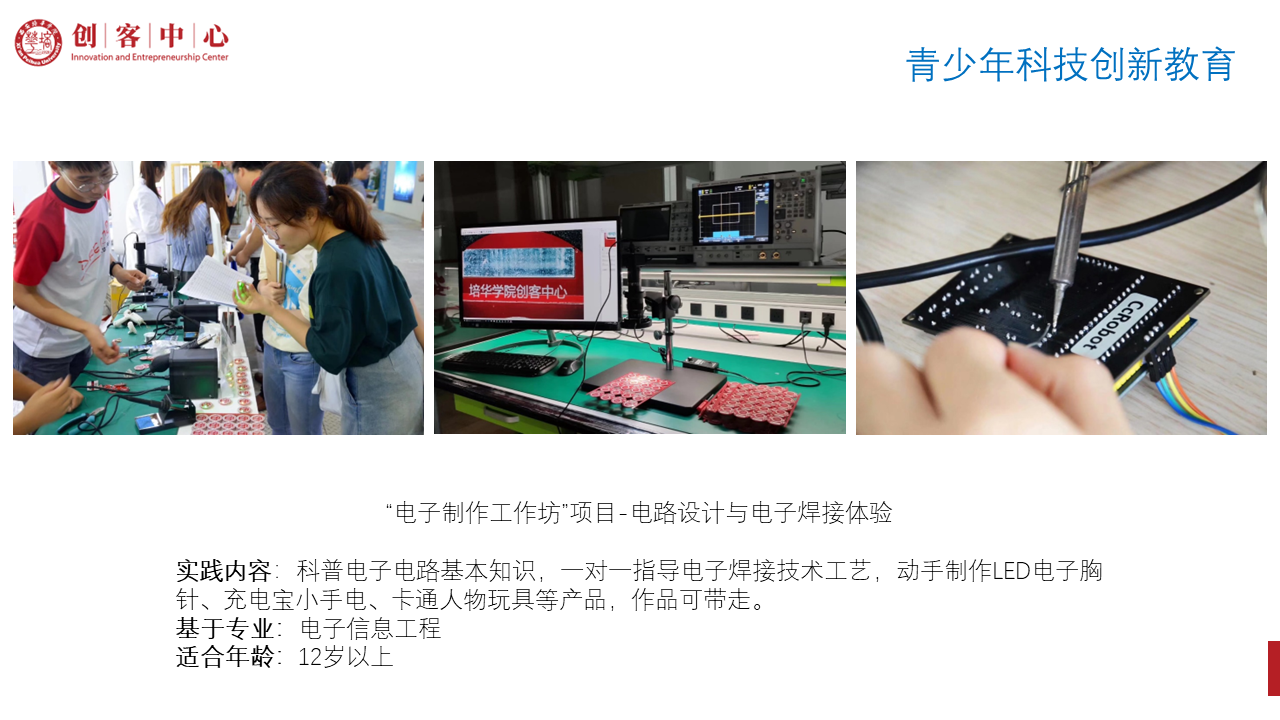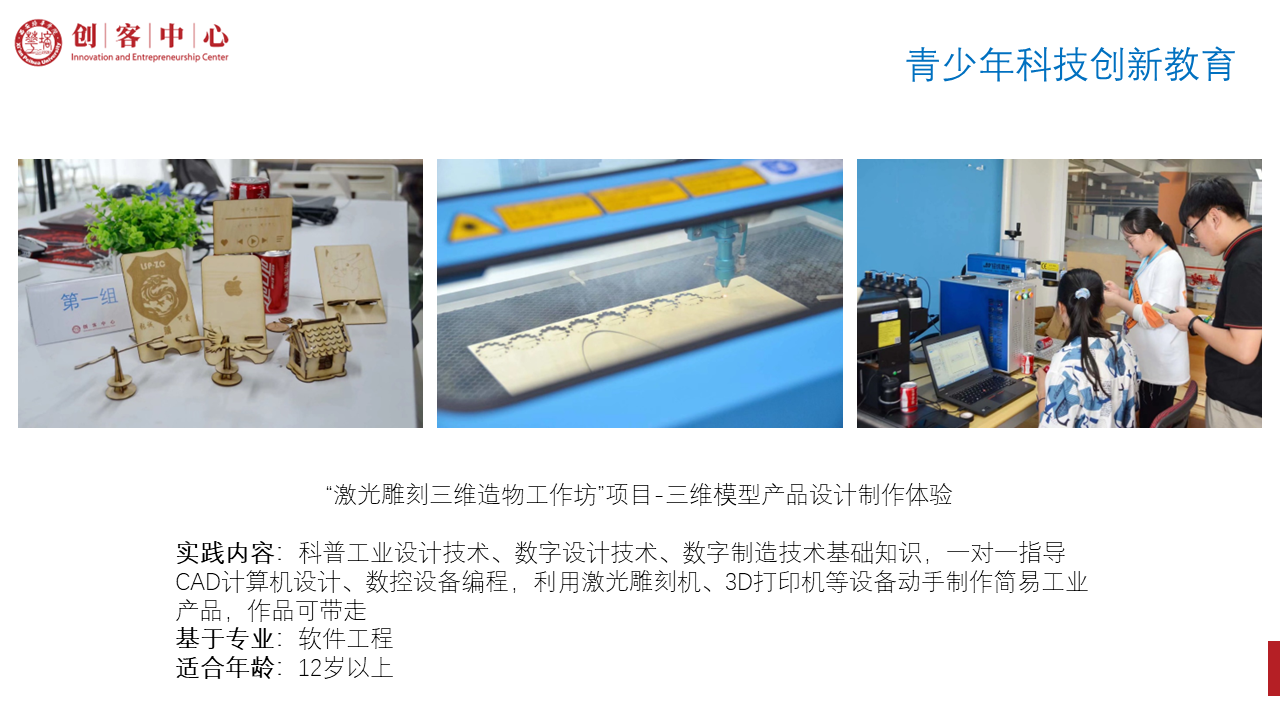 创客教育类课程活动内容既包含HarmonyOS(鸿蒙系统)、IoT(物联网)、WIFI6(第六代无线网络技术)、PCBA(印刷电路板及贴片焊接)、WEB全栈(网页前后端)等先进技术开发实战,也涵盖激光切割、激光打标、UV打印、CNC雕刻等相关数字制造技术的技能培训,同时辅以文化创意产品、影视文学作品等创作实现训练,全面培养了学生的创新思维和创客动手技能,得到了受训学员和学生推荐单位的广泛好评。