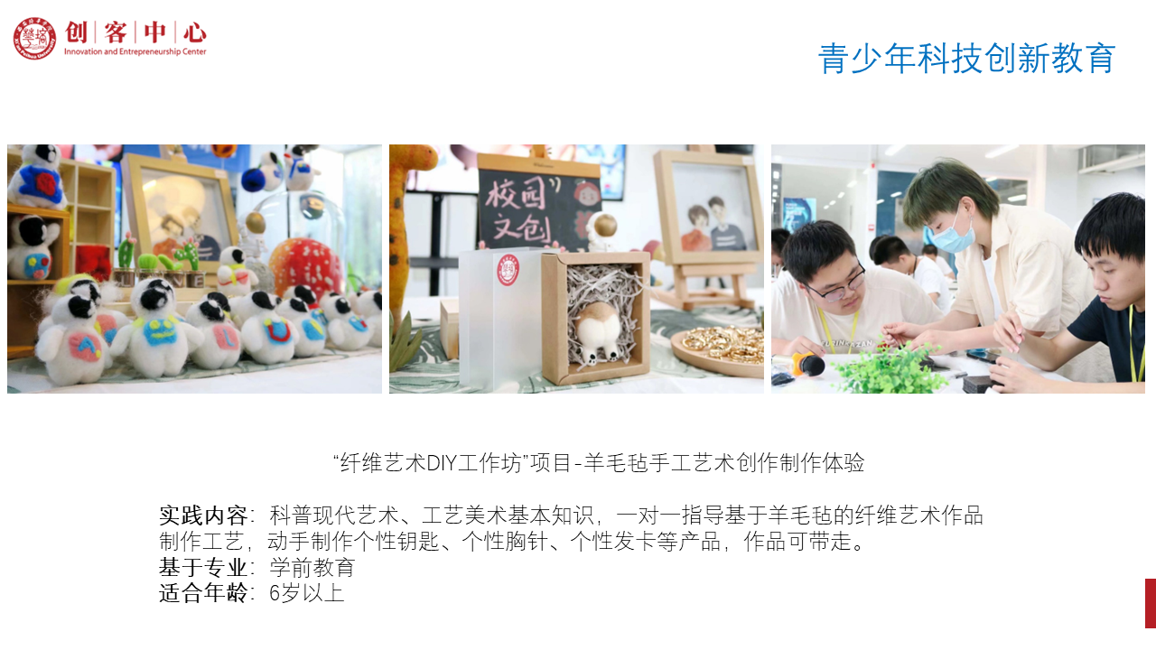 创客中心创客教育类课程活动,作为校企合作、产教融合项目的教学创新“试验田”,主要面向对科技创新、发明创造、动手实践、热爱创作等工作任务内容感兴趣的学生,通过创新思维训练、创客工具培训、创客项目课程、创客主题活动、社会实践体验、创新项目制作、主题演讲、创客马拉松竞赛、项目路演等9个方面对学员进行沉浸式、体验式授课。课程活动以项目成果为导向,以设计性、开放性任务目标和启发参与式课程为组织实施模式,着力推动学生有效行动,将专业再教育和创业能力训练紧密结合,将理论讲授和行动体验紧密捆绑,进一步增强创新创业教育的精准性和实践性,全面激发学生的创造力。