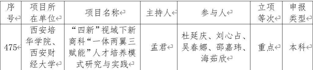 近日,陕西省教育厅 2025 年度高等教育教学改革研究项目拟立项名单公示,由西安培华学院会计与金融学院联合西安财经大学申报的《“四新”视域下新商科“一体两翼三赋能”人才培养模式研究与实践》成功获批重点项目,标志着两校在新商科教育改革领域的探索获得省级权威认可。