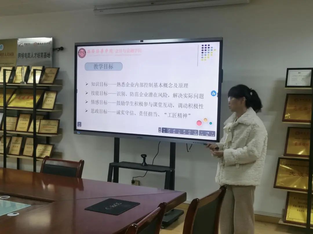 董瑞老师讲授《企业内部控制》课程中销售业务内部控制,课程内容熟悉,教学目标明确,能将课程思政元素融入课堂教学,让学生意识到销售业务诚信多企业发展的重要性,课堂讲授有总结有任务布置。