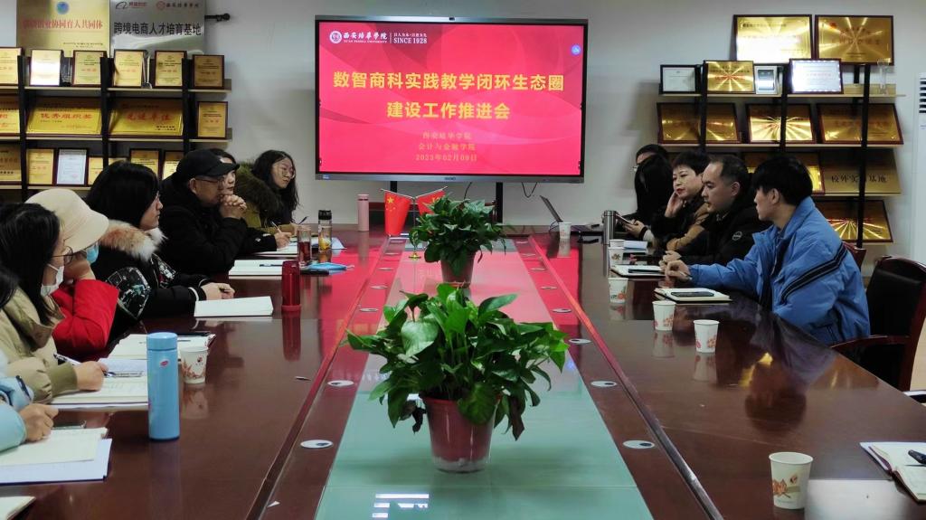 2月9日下午,会计与金融学院召开了数智商科实践教学闭环生态圈建设工作推进会。会议由实验中心张小妮主任主持,邀请赵选民院长、丁阳副院长、各系主任、专业带头人及新道科技股份有限公司、广州福斯特科技有限公司、南京欣博数字科技发展有限公司代表参加了会议。