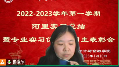 最后,丁阳副院长宣读西安培华学院会计与金融学院关于表彰2022-203学年第一学期专业实习优秀实习生的通报。会计与金融学院共有6个本科专业,三个专科专业,共计1365名学生参加了专业实习,经各实习单位推荐,系部选拔,结合实习工作开展情况,授予郭伟、谢亚娟等100多名学生“优秀实习生”荣誉称号,希望各位同学再接再厉,勇攀高峰,努力使自己成为一名新时代品学兼优的大学生。