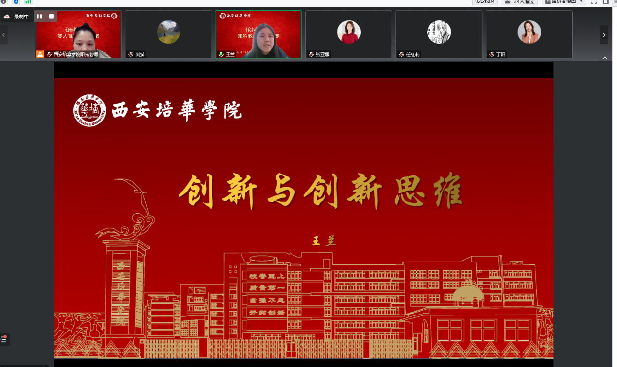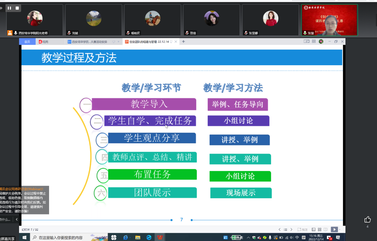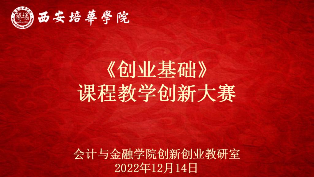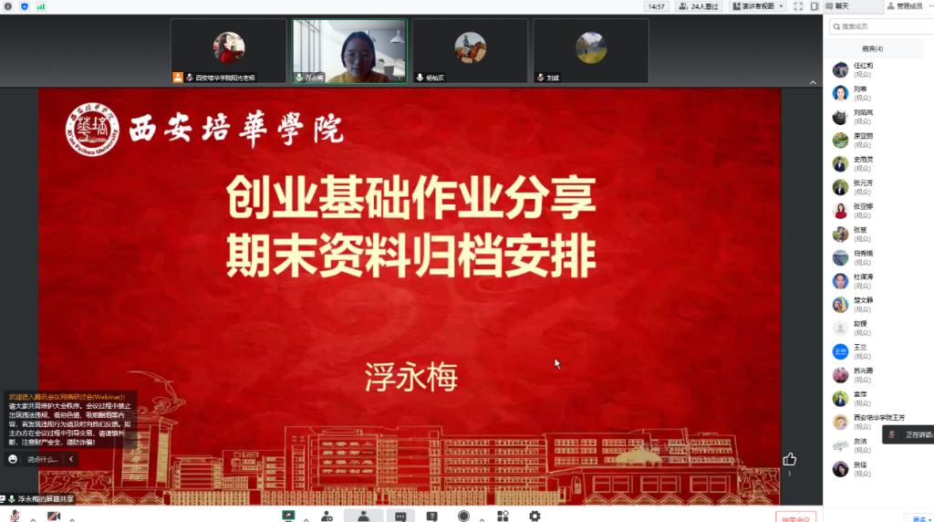 2022年12月14日下午,西安培华学院创新创业教研室举办了线上《创业基础》课程教学创新大赛,参加本次大赛的有创新创业教研室任课教师。西安培华学院教务管理中心刘斌主任、会计与金融学院杨仕鹏、丁阳副院长,西安培华学院创新创业教研室主任江凤香副教授,以及西安培华学院创新创业教研室所有老师观看了本次大赛,大赛由江凤香副教授主持。担当本次大赛的评委老师有杨仕鹏副院长、史立军副院长、丁阳副院长、杨柏欢教授、江凤香教授。