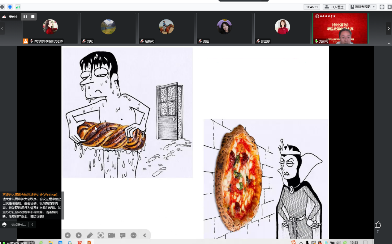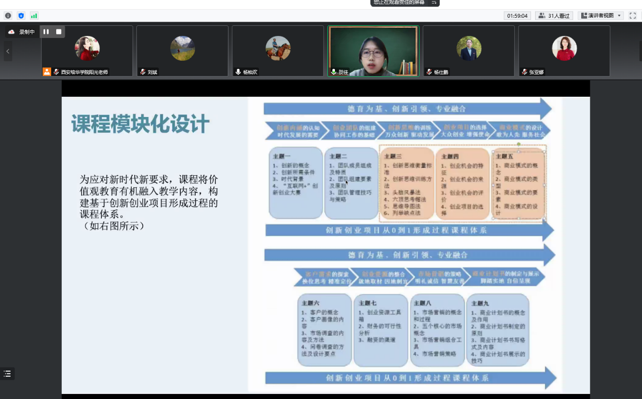 第二环节,先后由张慧、刘茹岚、贺佳、任红莉、王兰、段锞老师进行了课程教学比赛。通过线上讲说或视频演示的方式进行8-10分钟。参赛教师们分别从教学过程中的好的做法和经验、如何提高学生的兴趣、创业基础课程的价值等方面进行了极具现实价值的分享,给每一个参会者更多教学思路和教学方法方面的拓展。