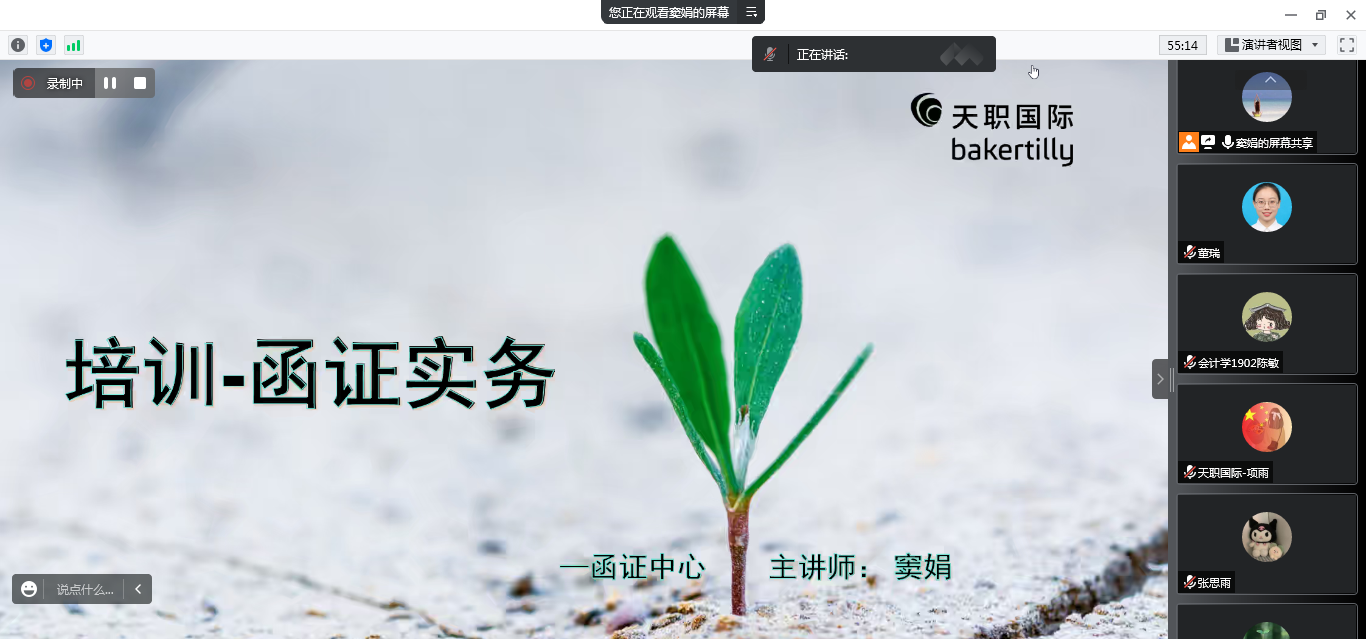 培训的开始首先由天职国际的项目经理陈烨向同学们介绍了公司的概况,企业文化、组织机构,制度规范等,其次由往届的优秀校友项雨为大家讲述自己在天职工作的点点滴滴及心得体会,鼓励大家努力向上,以期入职天职国际。培训打破了传统的以灌输为主的授课模式,选择以专家讲授为主,案例训练为辅,结合学生讨论,随后专家进行点评指导,培养学生分析问题与解决问题的能力,以此提高学生综合素质,培养学生创新意识与实践能力。