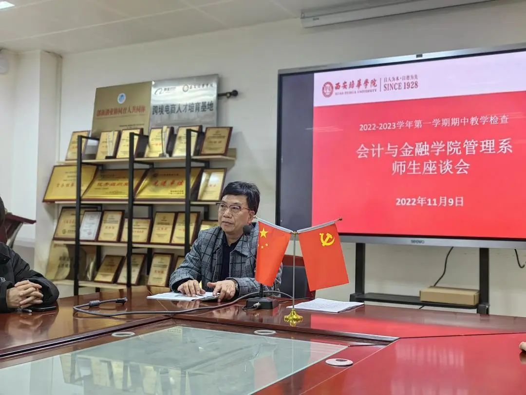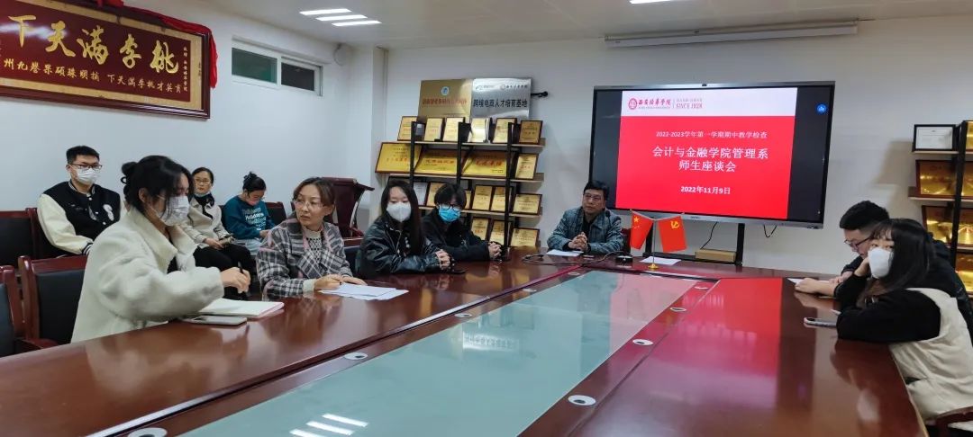 根据西安培华学院教务管理中心培华教函〔2022〕167号文件《西安培华学院关于做好2022—2023学年第一学期期中教学检查工作的通知》,为了促进我院教学质量和教学管理水平的不断提高,全面掌握上半学期教学动态,及时发现和解决教学中的问题,有效地监控和评价教学运行质量,会计与金融学院管理系于2022年11月9日(周三)12:15,在博远楼2115会议室顺利召开“2022—2023学年第一学期期中教学检查师生座谈会”。本次会议由管理系财务管理专业带头人陈利老师主持,出席此次会议的有会计与金融学院财务管理和人力资源管理两个专业全体教师以及2019至2023四个年级各班的班长学委等学生代表同学。