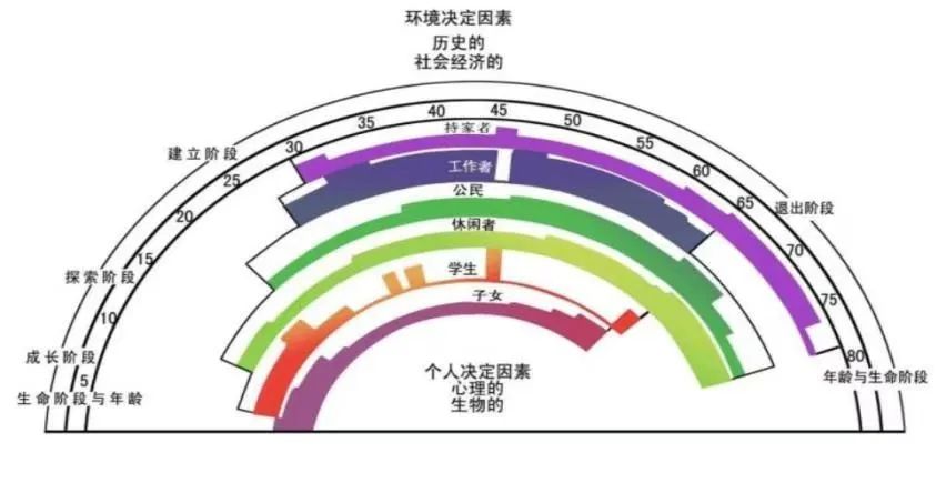 纵贯一生的彩虹—生活的广度:在一生生涯的彩虹图中,横向层面代表的是横跨一生的生活广度。彩虹的外层显示人生主要的发展阶段。