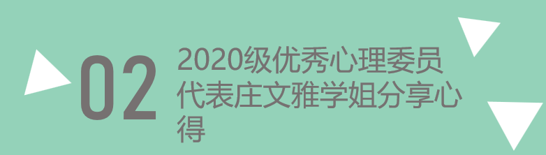 2020级优秀心理委员代表庄文雅学姐分享“十佳心理委员”“百佳心理委员”的评选材料和流程。