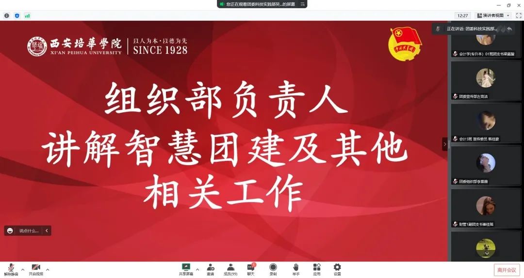 二十大来临之际,为协助大一各支部团干快速成长,加强大一各支部团干与团委的联系,更好将我院团委工作落实到实处。会计与金融学院团委特于2022年10月15日14:00召开本学期第一次团干大会,由于疫情形势严峻为响应防疫号召故本次团干大会采用线上形式。参与本次大会的有会计与金融学院团委书记寇方译老师、团委各相关负责人及大一各支部团干。