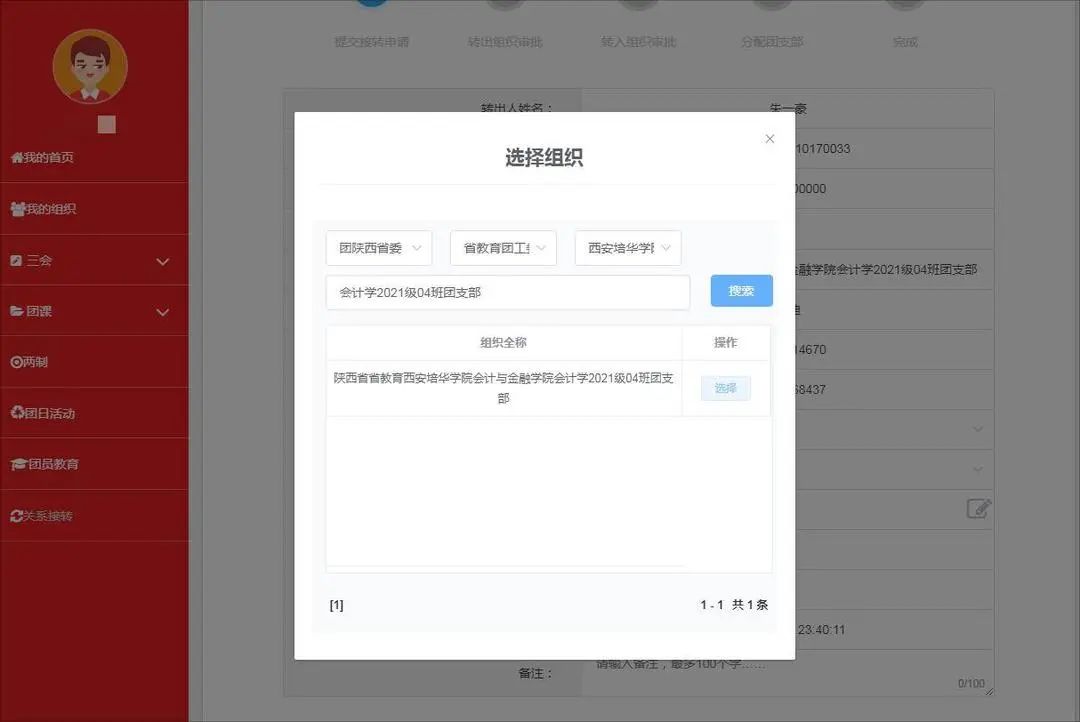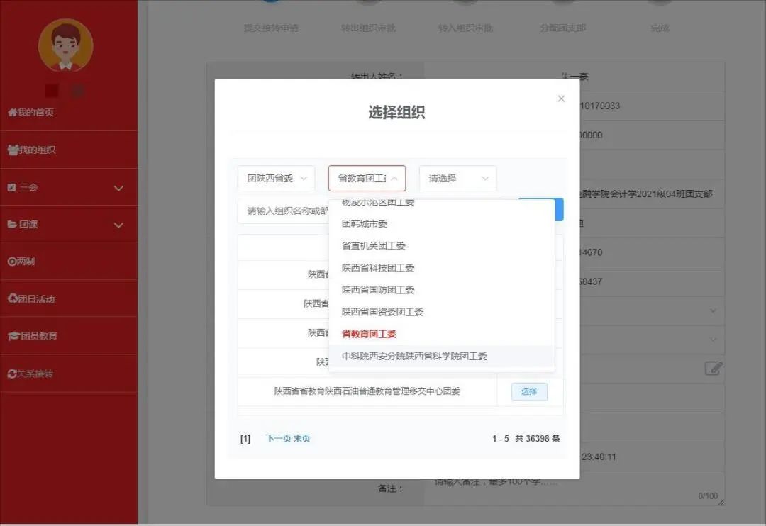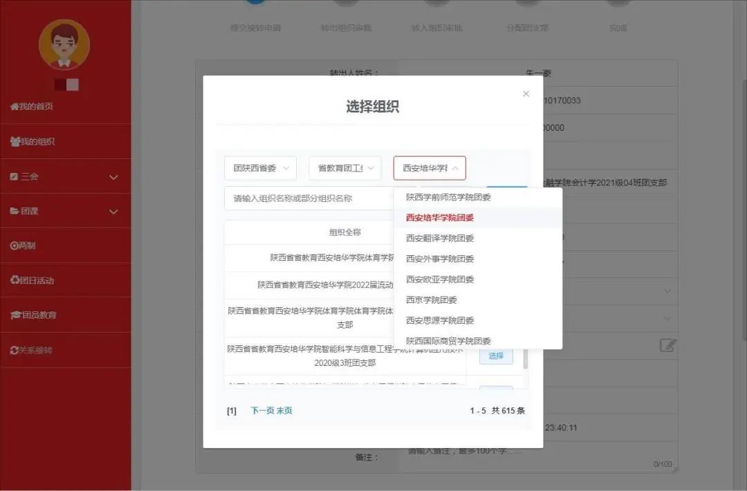 6、申请转入组织选择如下:团陕西省委——省教育团工委——西安培华学院团委