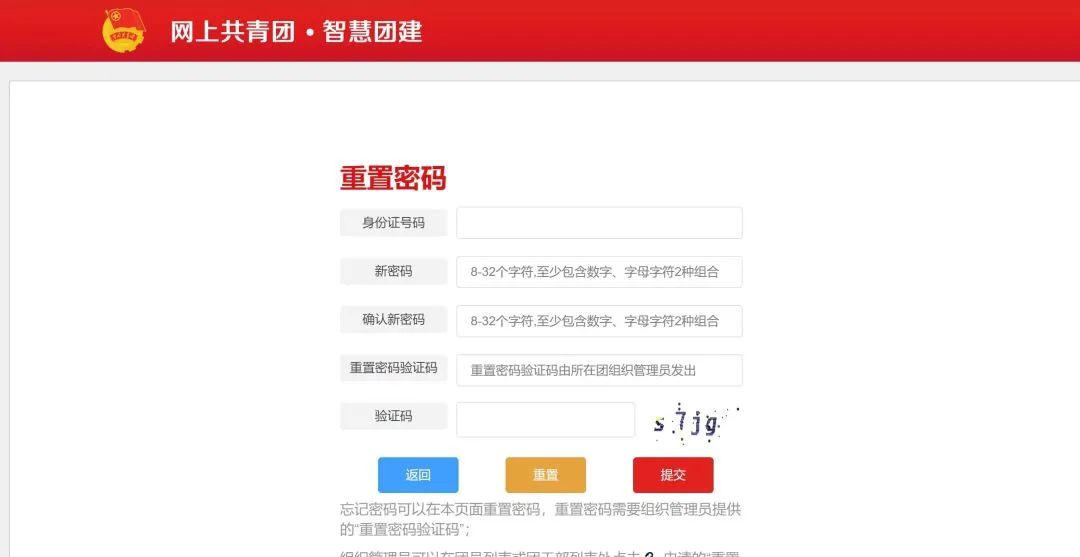 2、修改密码 Ps:验证码由上级团组织管理员后台生成(即联系高中团关系所在支部)