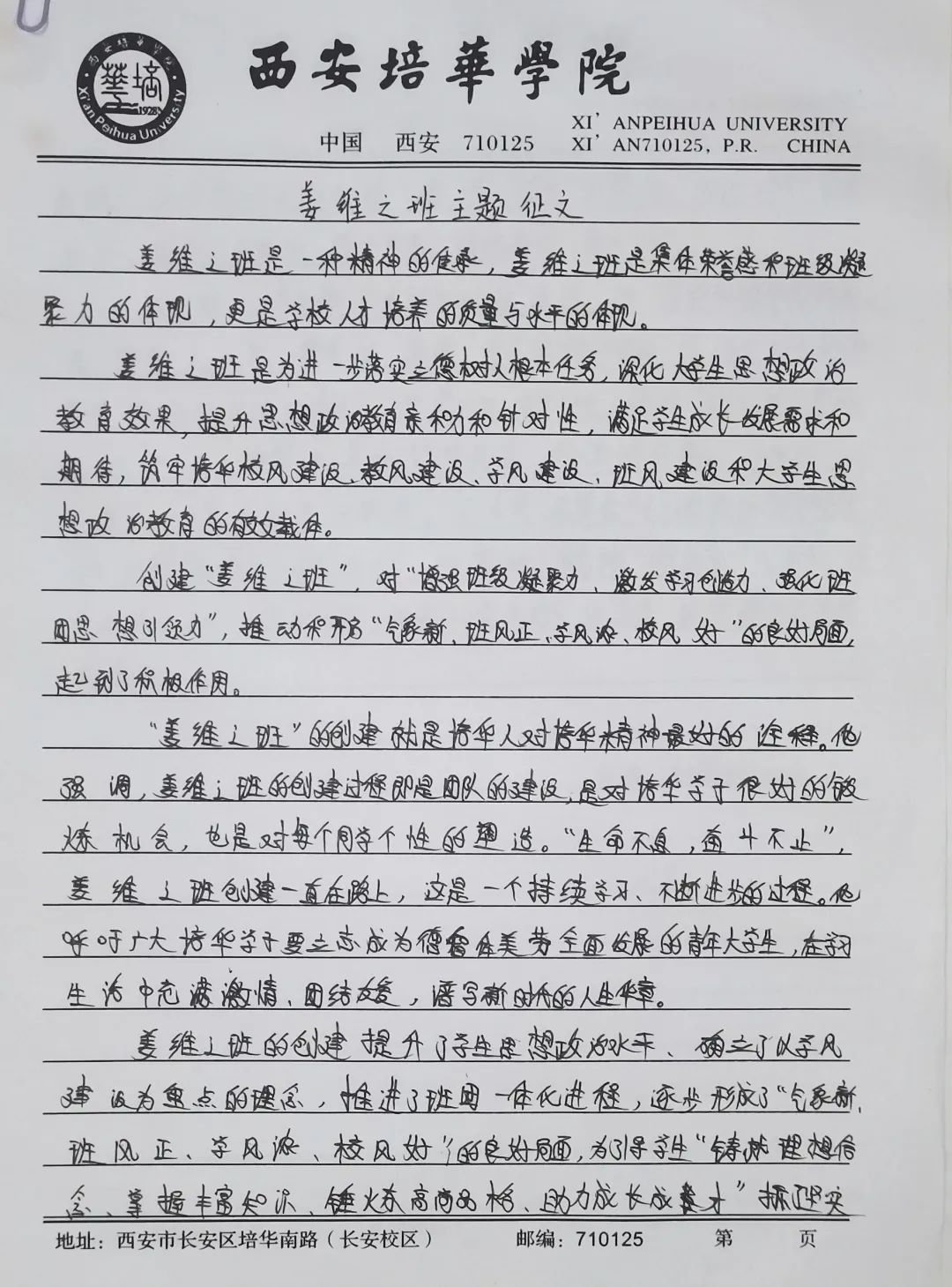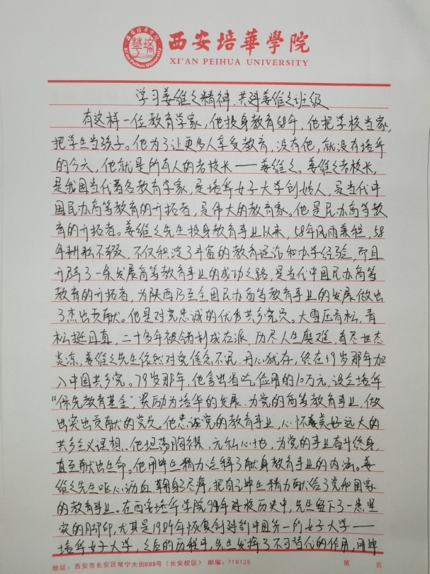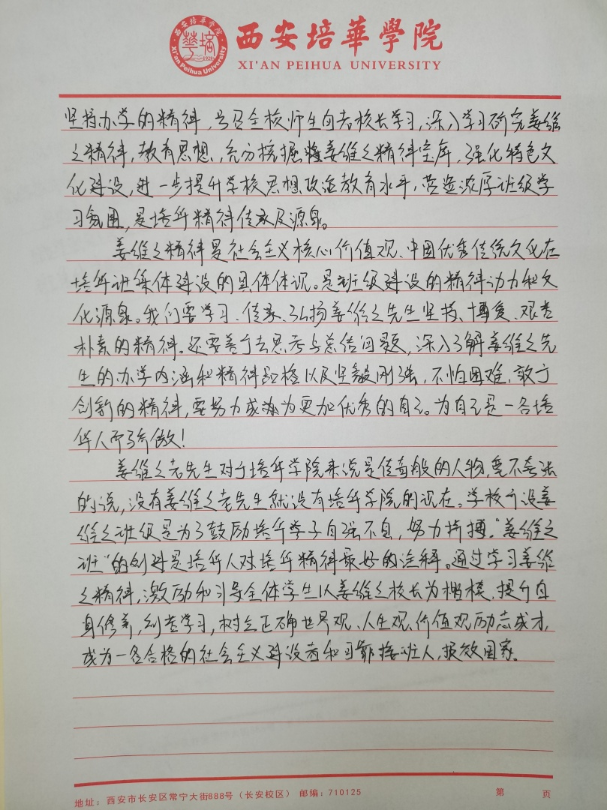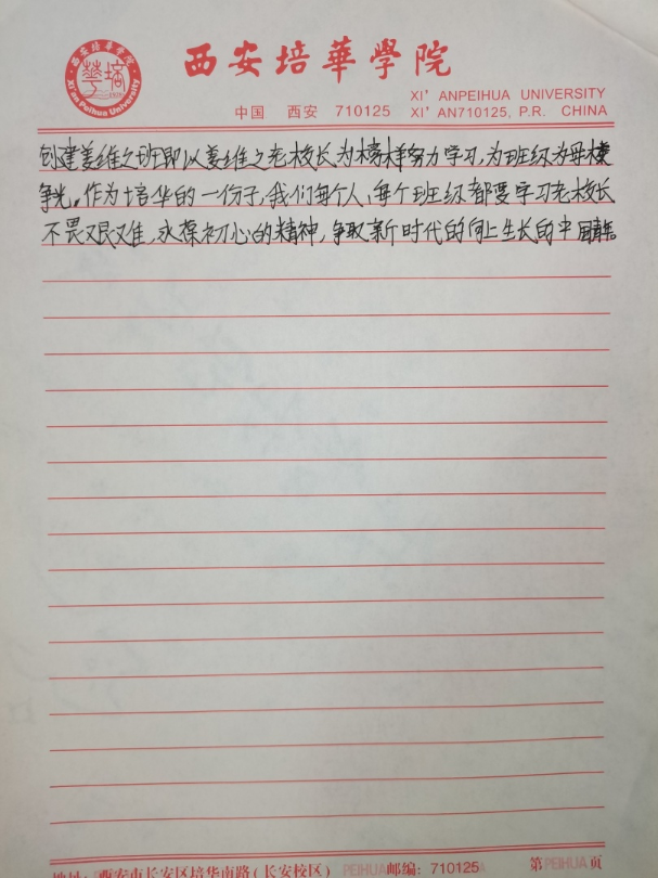 我们要争做时代新青年,成为⼀个有理想,有毅⼒的培华学子,⼀个人要拥有坚定的理想,强大的毅力,同时有作为,敢担当,用科学的的力量,用文化的知识武装自己,早日成为⼀个建设祖国未来繁荣发展的优秀接班⼈。同时,建设“姜维之班”又是学校教育的一大特色,开展“姜维之班”的建设,主要目的便是希望各学院可以立足实际,统一思想,提高思想认知,特别是自“姜维之班”建设开展以来,学生们能够严格约束自己,学风建设,日常文明行为得到更⼀步的强化。培养了一大批坚毅刚强,不怕困难,敢与创新的优秀学子。